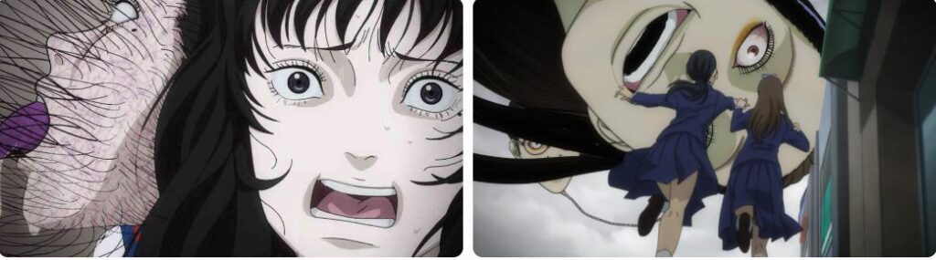 • 動きと時間の流れ:マンガの静止画では想像するしかない肉体の変形や崩壊が、アニメではスローモーションや連続した動きで視覚化。首吊り気球の浮遊や富江の再生過程が、原作以上に生々しくトラウマ級。